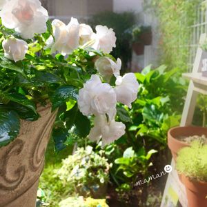 新しい仲間 お気に入りの鉢にカリフォルニアローズ(ホワイト)を4株植えました 盛り盛りになったら良いなぁ〜〜💕