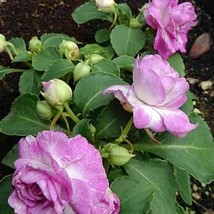カリフォルニアローズ 薔薇咲きのインパチェンスです 4色寄せ植えにしたのですが、何故かこの色だけが勢いあります 白は咲いてくれません〜