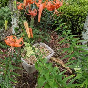 ピラミッド紫陽花とオニユリ+隠れていますが、薔薇が、コンテナに!今年は花咲きませんでした。