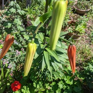 こちらにも!昨年の、種をばらまいていたら、芽が出てきて、咲きそうです。オニユリ🌱☀️