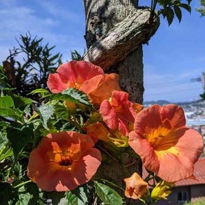 ノウゼンカズラ!マキノキに。巻き付いているの、わかりますか?太いノウゼンカズラの茎です。😰😱🙀びっくりしますよね!何年もかかり、この茎の太さになりました。🤔🧐🙄😳😅🤣