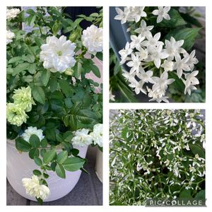 今日は風が涼しく感じます♪ 今咲いている爽やかな白いお花を集めてみました🤍 ⬅️グリーンアイス 少し前、葉が元気ないので切り戻しました。きれいになって花も蕾もいっぱいです。 ↗️ペンタス 初めてお迎えしましたが、可愛い花ですね♡ ↘️ユーフォルビア ダイヤモンドフロスト 6月末に寄せ植えにしたものですが、いつまで経ってもその時と同じままの姿。 挿し芽で冬越しさせて、ドームに仕立ててみたいです♪