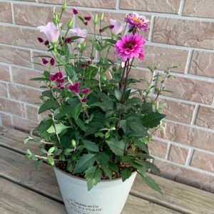 可愛らしく、上品な寄せ植えはいかがですか🌷 全体を紫で落ち着いた雰囲気を出しつつ、ピンクのトルコキキョウで可愛らしさもプラスしてます! 使用苗 銅葉のダリア トルコキキョウ 千日小坊 その他グリーン