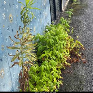 通学通勤路に生えているあの二人(2株)は何者なのでしょうか。 それはそうとして、連日の暑さで背の高い方の子が死にかけてますね。