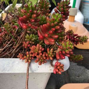 八百屋さんの端っこに野放し状態のプランターから真っ赤に紅葉した多分虹の玉であろう多肉植物が誰にも見られることなく咲いていました…