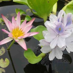 今朝スイレン鉢を見たら、先月近所の用水路から調達したホテイアオイがもう開花していました。熱帯スイレンとコラボです。