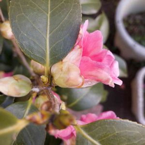 玄関で冬越しした椿が 昨日 ついに咲いた かわいい🩷 愛おしい 💟 嬉しい 🥰