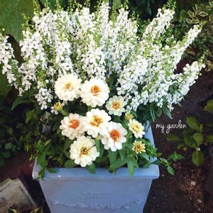 今日お迎えしたお花達と脇役に増やしたスーパートレニアを❀ ホワイトで涼し気な感じに寄せ植えしてみました❁
