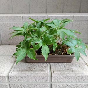 (地道投稿)先週の木曜日戻り、日陰で休ませた1️⃣「イワヤツデ タンチョウソウ」です。GS眺め真似👍角鉢に植え替えしました。無事に花も咲きました。2️⃣「デンドロビウム エンゼルベイビーグリーン」先月物置脇の鉄管遮光網庫に入れました。墓掃除準備中に開花を確認して投稿します。