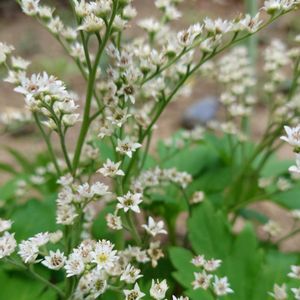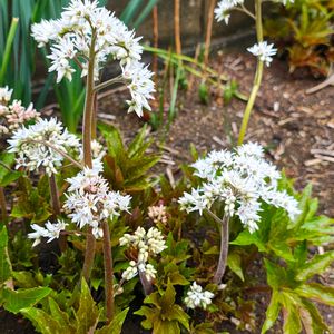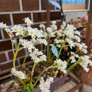 タンチョウソウ ユキノシタ科タンチョウソウ属 多年草 別名はイワヤツデ 中国東北部から朝鮮半島原産 川岸の岩上や川沿いの岸壁に生える。 花期2〜3月 花は葉が出る前や同時に、花径5mmほどの白い花を多数咲かせる。 白い萼と白い花弁が重なりあって、花びらが10枚あるように見える。