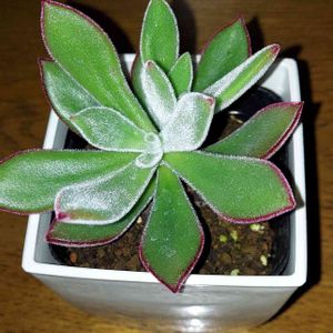 多肉 エケベリア ハムシ― 赤の縁取りが可愛い 葉っぱは白い毛で覆われています…