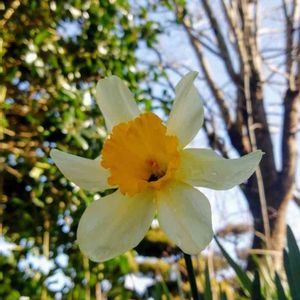 💐今日のお花 3 💐 ラッパ咲きスイセンです 雨上がり🌂 青空を背景に・・・ 朝日を受けて✨✨