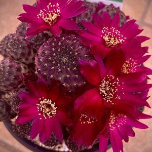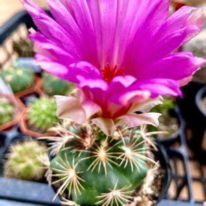 おはようございます(*^^*) ピコ🌵💕開花🌸 花冠みたいで可愛いですね❣️ 濃いめの鮮やかピンク デカい🌸1輪は 和光丸 (大統領の変種らしいです 教えていただきました(⋆ᵕᴗᵕ⋆).+*ペコ) ちょびちょび咲き出したのは 高砂さん🌵💕 本日はピンク特集でした😆