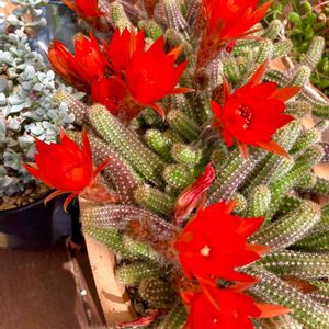 こんばんは(*^^*) 白檀です🌵(~˘▾˘)~ニョロニョロ 目に鮮やかな朱色ですね❣️ 目が痛いょ やっと´Д`)ヤット‥開花がみれました 🌸🌸🌸 サボテンの花は 魅力的ですね❣️ (づ ̄ ³ ̄)づ🌵🌵💕