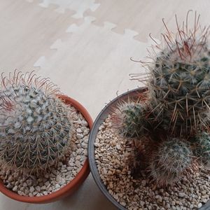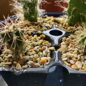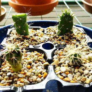 この前切ったウチワサボテンを乾燥させたので植えました ついでに柱サボテンと花サボテンの 大きい幼苗を個別に植え替えてます