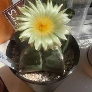 【鸞鳳玉 ランポーギョク】 アストロフィツム属 今は休眠期ですが 刺の無いサボテンの開花は 初めてで感激しました‼️ つややかでピカピカでした✨ 5稜タイプ W10㎝ (撮影2022.9.5)