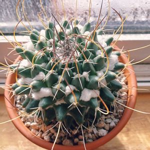 このネーミング 本当⁉️ 【江守】フェロカクタス 学名「emoryi(エモリー)」➡️和名【江守】 当て字とのこと 俳優の江守 徹さんを連想してしまう😊 突起したイボイボの体が 金平糖のようです😆 W9㎝×H6㎝(トゲ含まず)