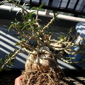 パキポディウム ビスピノーサム マダガスカルではなく南アフリカの塊根植物❗️ 自分の育てているパキポディウムの中では、冬型のナマクアナム(光堂)を除き最も寒さに強い。 同じ南アフリカ産でもサンデルシーは葉を落とし、サキュレンタムも僅かに葉が残っている状態。 6年間育てていて、毎年常緑で越冬しする。 耐寒性が強い為今年は軒下管理に切替て断水していたら塊根部分が萎んでしまった❗️ この状況でも水分欲しがるのか⁉️と驚いた次第。 軒下管理とはいえ朝はマイナス気温もあったんですけどね。 なのでお水あげました💦 追記 水遣りは少しだけです。今は部屋で養生してます。やはり葉や塊根部の表情から寒かったみたいです。 真似しない方が良いです、