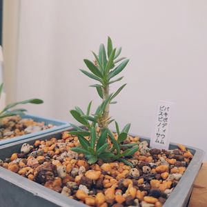 チビパキポディウム達を、 日当たりいい所に移動。 休みの日は日光を求めてちょいちょい 移動させるのが日課。狭いベランダで ごめんなさい。(_ _;)