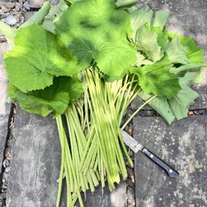 蕗 収穫~水煮~薄く味付け 苦んまーーーぃ ٩(๑°༥°๑)۶🕒 ⋆☽☁︎︎꙳夕飯 板付けと紅白エビちゃんのいるカレー屋さんへ 小さなコウモリラン販売してる レースプラントってのも気になるなぁ