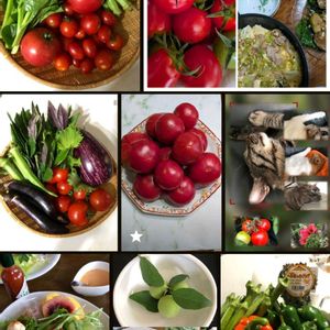 花より団子🍡の私だから 今日のお花🍅 大好きなトマトを〜😋🍅👍 過去picよりコラージュです みんな産直です🥰 真ん中が完熟の6月のトマト🍅これは最高です😋👍 アイコやプチプヨが最近お気に入り🍅 右下のコドモピーマン🫑も お気に入り オマケの猫も🤭💕 明日も良い1日を〜🍀