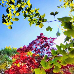 真っ赤なもみじ越しに落葉し始めているイチョウの木を見上げたら…感動😚💓 こちらのイチョウの葉はとても小さくて可愛い🥰写真左上の方には、落葉したイチョウの葉がもみじの葉の上にあり珍しい眺めでした😆