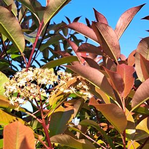 花散歩 桜が過ぎてから 次々と花達が咲きだし赤と緑の葉 レッドロビンにも 気になっていたこの生垣に蕾がついているのは初めて意識! 友人に見せたら あらー 花があるんだ❗ と驚いていました