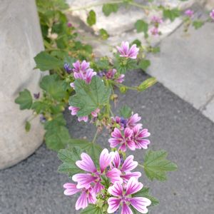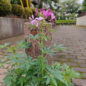 クレオメ(西洋風蝶草) 舗装レンガと車止め基礎コンクリートに挟まれた狭い隙間からド根性で花を咲かせています。