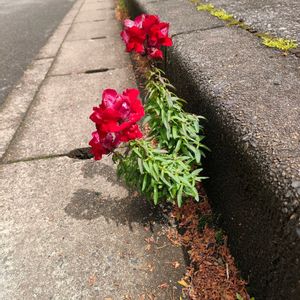 路側溝の蓋の隙間に生えたキンギョソウです。
