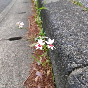 路側溝のフタと歩道縁石の隙間に咲いたヒメヒオウギです。