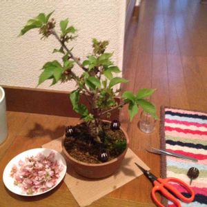 6月に購入した八重桜の盆栽。 来年の開花を楽しみに育てています。