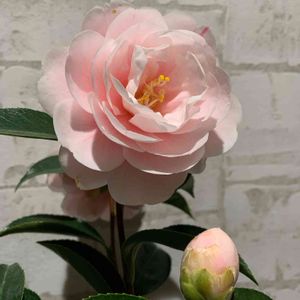 おはようございます☀ いいお天気〜!って外に出たら、冷たい風がびゅーびゅー💨 「つばき 王昭君」が2輪、双子咲き?して、くす玉みたい🎊💕