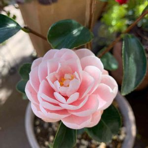 おはようございます☀ 2年目のツバキ、「王昭君」。 たったひとつだけ付いてたツボミ、キレイに開いてくれました🥰 小さな鉢植えにしてるんですが、 やっぱり、地植えにした方が大きくなりますよねー、、。 場所がなくて、悩み中😅