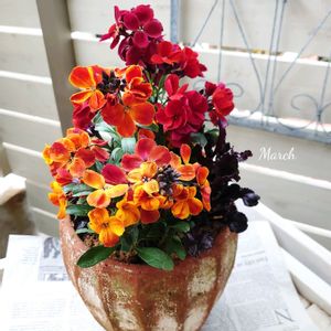 今日は晴れてたけど、北風が冷たかったです ①フリンジパンジー きもの ②③④寄せ植えしてます 渋い赤色がきになり、新しく育てるチェイランサス シュガーフラッシュ ヒューケラのビターショコラ まだ花がないパンジー オレンジスライス 花が咲いたらシックにまとまるかな 昨日夜、町と村が合併20周年で花火が10分間上がりました🎆 家から見えましたが、鉄骨ビニールハウス越しに楽しみました🎵