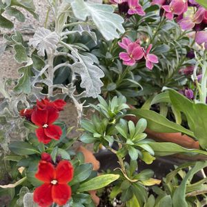 チェイランサス☺️ 赤も咲きました♪ ピンクはモリモリに花をつけて、赤が出てこないので枯れてしまったのかと思っていましたが、ピンクとシロタエギクに埋もれて咲いていました。