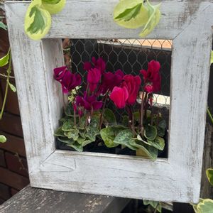 ガーデンシクラメン2色 寄せ植えにする前に お気に入りの額縁🖼️型プランター に 仮りおきしてみる‼️ これもかわいい😍 もうちょっとこのままで、、、 ❤️🩷