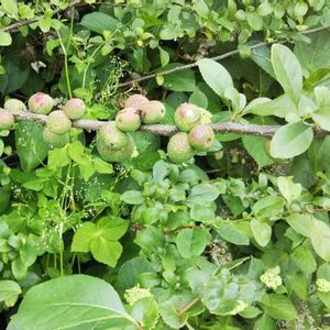 ばぁばの庭 「ボケ」 にたくさんの実が実りました。 恐ろしく酸っぱいけど加工すれ食べられるらしい。完熟になるのを待ってジャムにしてみよう。どんな味がするかな?楽しみ(*^^*)