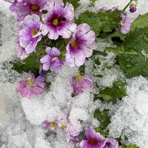 今季初めての積雪です 雪に埋もれた、桜草🌸❄️ 雪を少し払って、スマホで🌿