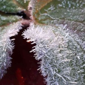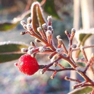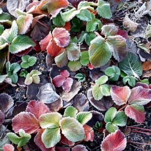 庭に逃げ出した苺 朝日に照らされ 霜に覆われ…