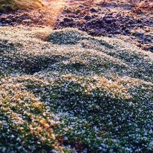 氷ったサギナが 朝日を受けて キラキラしています♪ 真ん中に ぽつんとあるのは すみれ…