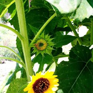 葉っぱに 守られた ヒマワリの 赤ちゃん発見…🌻
