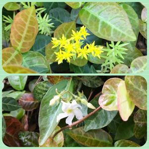 セダムの花とハツユキカズラの花 ハツユキカズラに隠れてセダムの花が✨ 昨日みるはさんの投稿でハツユキカズラに花が咲く事を知り庭に出て探してみました🔍木に絡みついている地植えのハツユキカズラに風ぐるまのような形の花を発見❣️