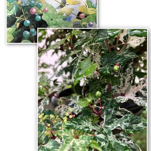 🎶斑入りの野葡萄瑠璃姫♬ ツルの先に実のような物が付き始めましたウレシイ! 出会いは、安野光雅氏の絵(画面左上)それからGSの早優さんの投稿を見て、探して購入。 手元で眺めて、嬉しくて、いつ、瑠璃色になるかなあと、、、 今の所、順調だと思うのだけど、瑠璃色を見るまでは、気を緩めず観察❢