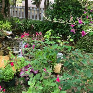 🎶雨上がりの庭の巡回♬ はぎさんとチェリーセージさんが仲良くなってました。そこへ、◯◯◯が遊びにやってきて「仲間に入れて♡」 風に揺られて、みんな気持ち良さそうでした。 ◯◯◯に入るのは何かわかりますか? 探してね♡ ˎˊ˗