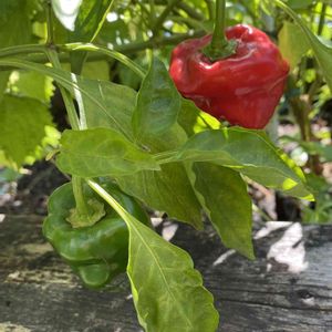 初夏に勤務先花壇に植えたピーマン🫑さんが大きく育って🌿まだまだ花が咲き実がなっています。 緑のピーマンと赤くなったピーマンが綺麗です🫑*\(^o^)/*ピーマン大好き😋 ピーマンが熟すと赤くなるそうです🫑今日は収穫しようかな♪(๑ᴖ◡ᴖ๑)♪
