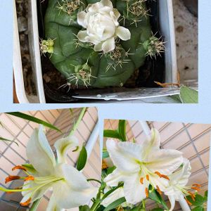 オリエンタルリリーさんが綺麗に咲きました*\(^o^)/*縁がピンク色です💕 2本有るうちの2本目の方のブルーベリー🫐の実が色付いて来ました(*^^*) 雨に打たれたブルーベリーの葉の水滴が綺麗でした💧 真ん中の多肉さん達は、大規模修繕で、お引越し中にポロポロポロポロ落下した葉をザクザク適当に挿しっこしといたのが育って来ました(*゚▽゚*) 今となっては何種類有るのかも名前もわかりません🤣💦