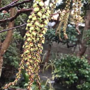 キブシ 玉簾か簪のようにビラビラと林の縁で目立っている♪雌花は分かりやすいが、雄花なのか両性花なのか? 柱頭と8本のヤクの高さが同じに見えるし、雌花序や両性花序の玉簾は短いという説明からいえば、両性花かな(^.^) 雄株はどこじゃ~😆
