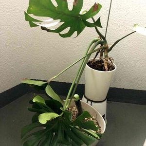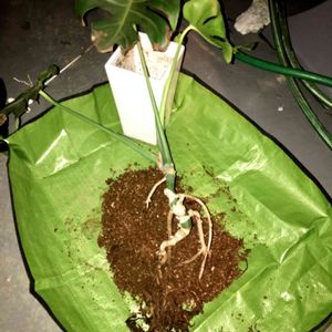 夜にも関わらず…… 葉先が枯れてきた実生のモンステラデリシオーサ。2011年生まれにも関わらず小さいままで、明らかに根腐れしているとわかっていたのでスリット鉢に移し変えました。 根もこんなにスカスカにしちゃってごめんね… 陶器鉢は通気が悪くてやっぱり危ないな(´・_・`)