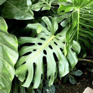 モンステラがワサワサしてきました 大きい株は穴あき葉っぱに期待です☺ 斑入りは垂れやすくてどうしたものかと考えていたのですが、葉水で随分シャキッと変わるものです。びっくり。