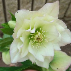 八重咲きダブルのクリスマスローズ🤍 中央部のグリーンと薄いピンクのピコティーが素敵💚💗 友達のお宅にて